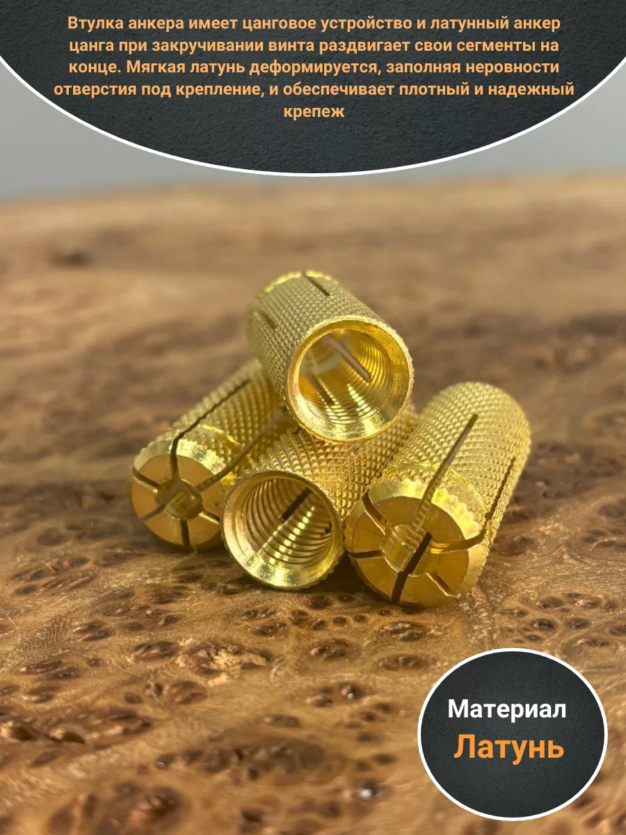 Представляет собой простейшую и надежную конструкцию. Это небольшая втулка из латуни покрытая нарезкой для лучшего сцепления со стеной. Та часть, которая расположена в глубине отверстия, имеет деление на четыре сегмента. Эти сегменты предназначены для обеспечения надежного распора и крепления в теле стены.