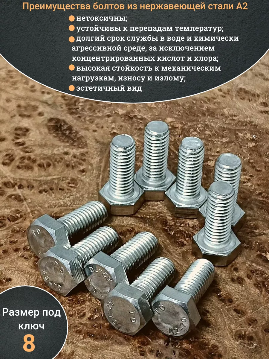 Нержавеющая сталь данной марки повышает прочность болта, который выдерживает динамические усилия и вибрацию. Изделие монтируют в помещениях и вне их. Крепеж имеет практически неограниченный ресурс работы, на который не влияет воздействие воды и изменений температуры воздуха.