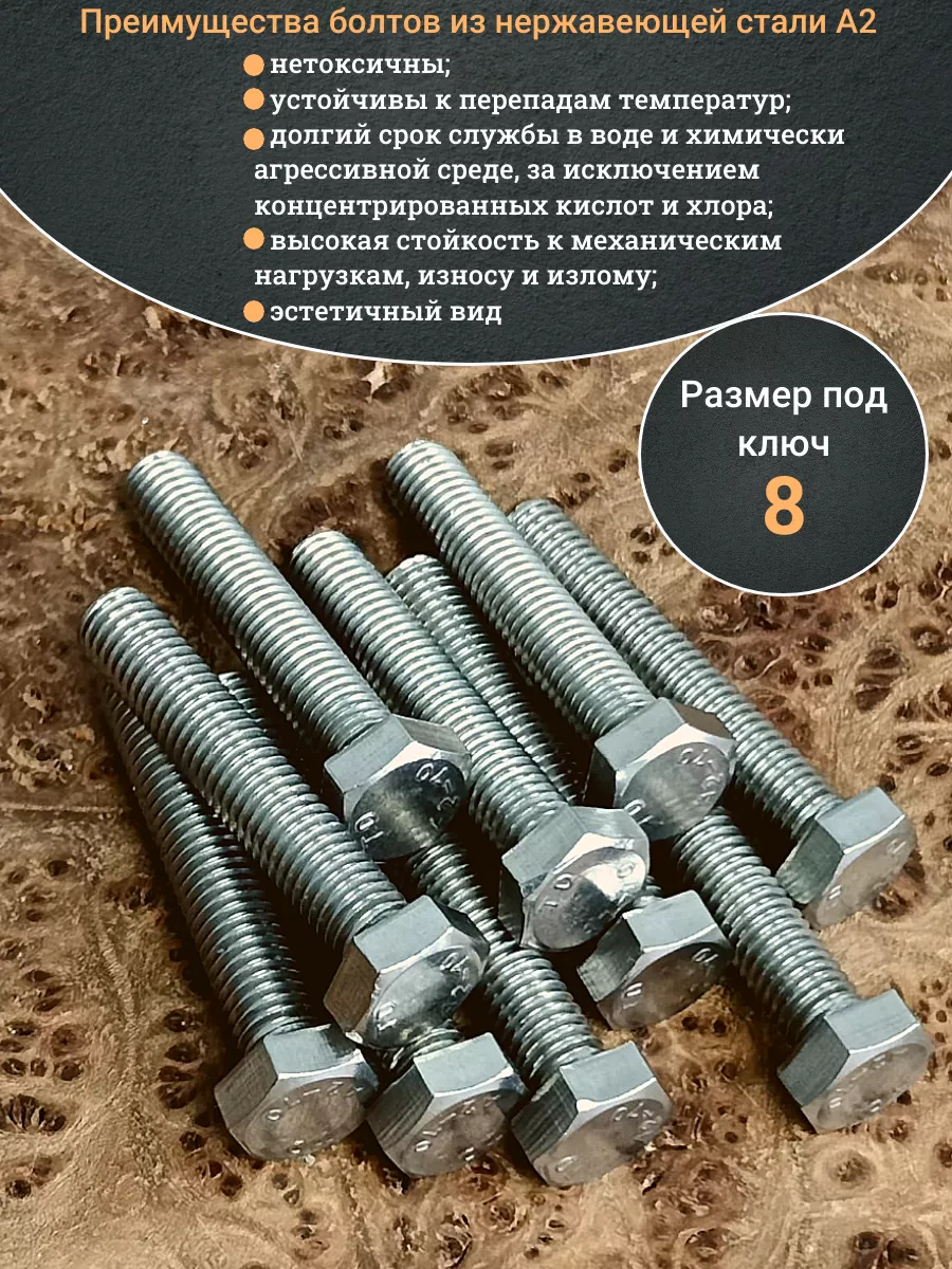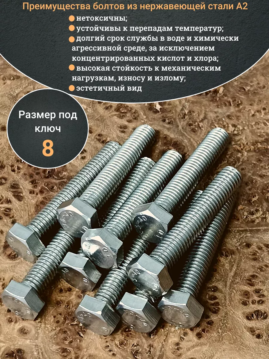 Материалом для болта служит нержавеющая сталь класса A2. У изделия есть цилиндрический стержень c полной резьбой М5 и шестигранная головка. Шляпка передает крутящий момент от ключа к крепежу при завинчивании. Для создания прочных резьбовых соединений крепеж используется в комбинации с шайбой и гайкой или завинчивается в отверстия с нарезанной резьбой. Чтобы исключить электрохимическую коррозию, шайбы с гайкой делаются из коррозионно-устойчивой стали либо нейтральных полимерных материалов.