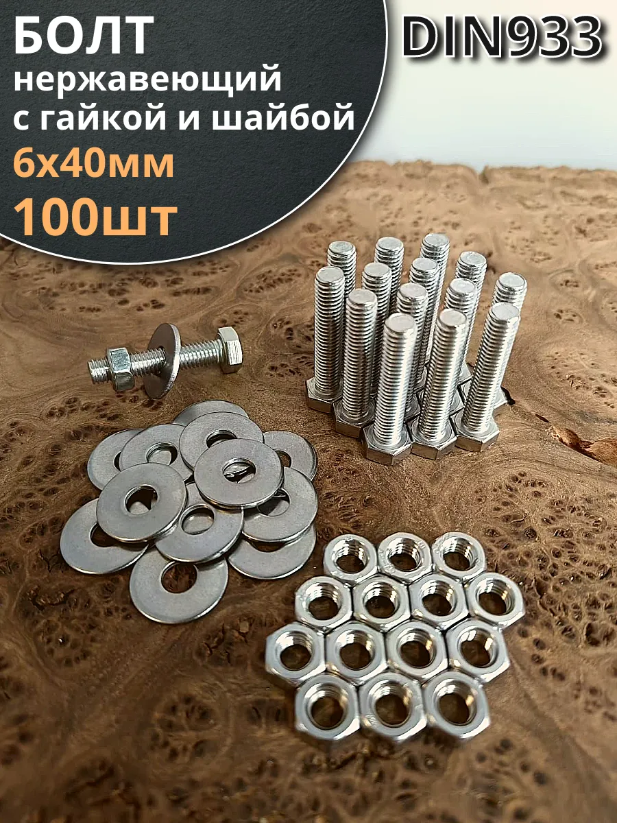 | Болт нержавеющий 6х40 мм DIN933 с гайкой и шайбой, 100шт. | 33375 | 1 шт. |