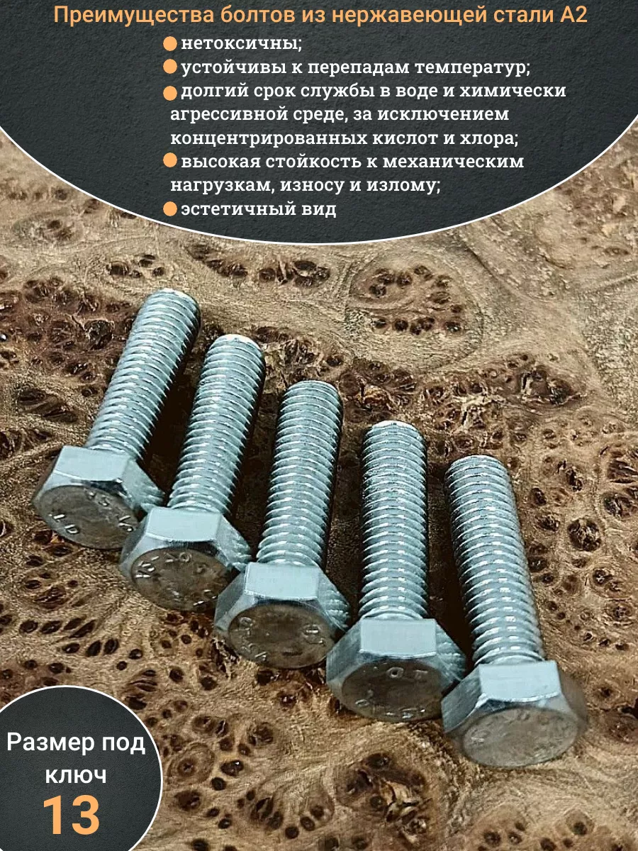 Материалом для болта служит нержавеющая сталь класса A2. У изделия есть цилиндрический стержень c полной резьбой М5 и шестигранная головка. Шляпка передает крутящий момент от ключа к крепежу при завинчивании. Для создания прочных резьбовых соединений крепеж используется в комбинации с шайбой и гайкой или завинчивается в отверстия с нарезанной резьбой. Чтобы исключить электрохимическую коррозию, шайбы с гайкой делаются из коррозионно-устойчивой стали либо нейтральных полимерных материалов.