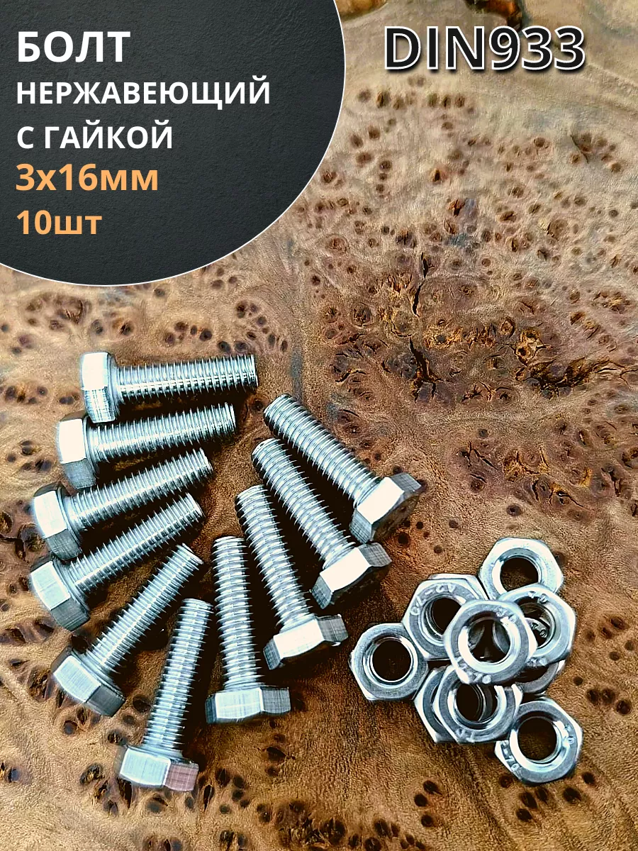 Болт нержавеющий М3х16 мм DIN 933 с гайкой , 10 шт.