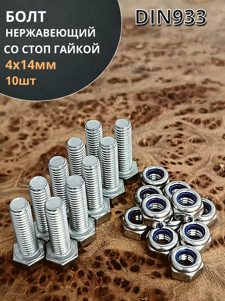 Болт нержавеющий М4х14 мм DIN 933 с гайкой , 10 шт.