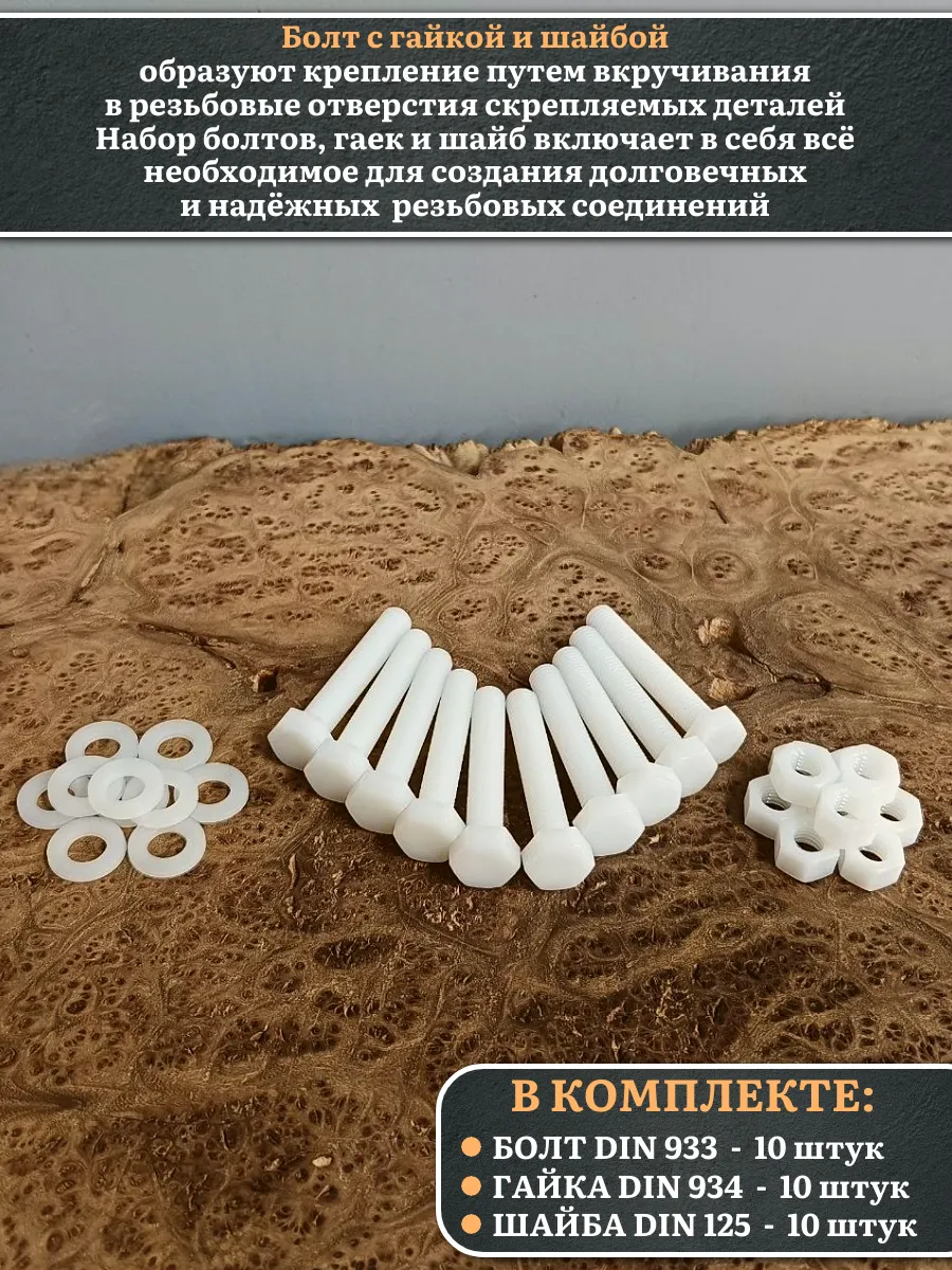 Болт полиамидный 10х60 мм DIN 933 с гайкой и шайбой