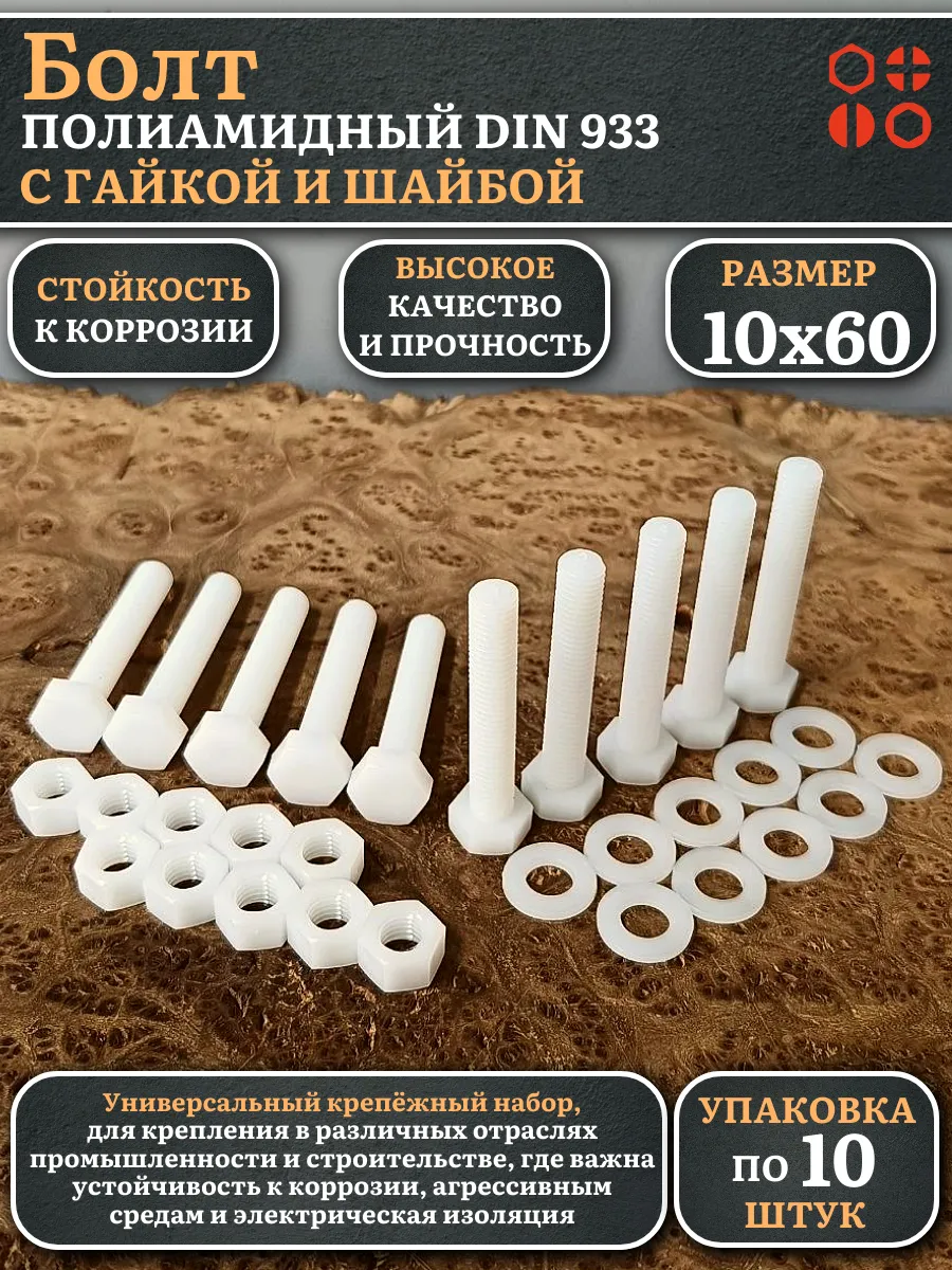 | Болт полиамидный 10х60 мм DIN 933 с гайкой и шайбой, по 10 шт. | бп1060933наборГШф10 | 1 шт. |