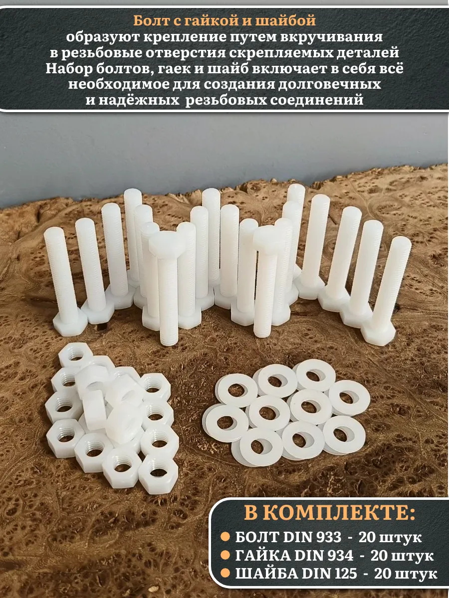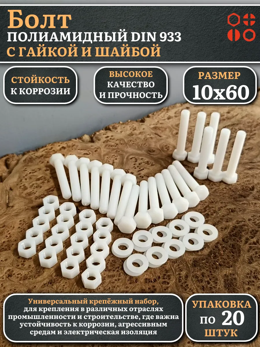| Болт полиамидный 10х60 мм DIN 933 с гайкой и шайбой, по 20 шт. | бп1060933наборГШф20 | 1 шт. |