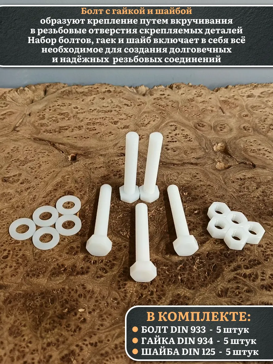 | Болт полиамидный 10х60 мм DIN 933 с гайкой и шайбой, по 5 шт. | бп1060933наборГШф5 | 1 шт. |