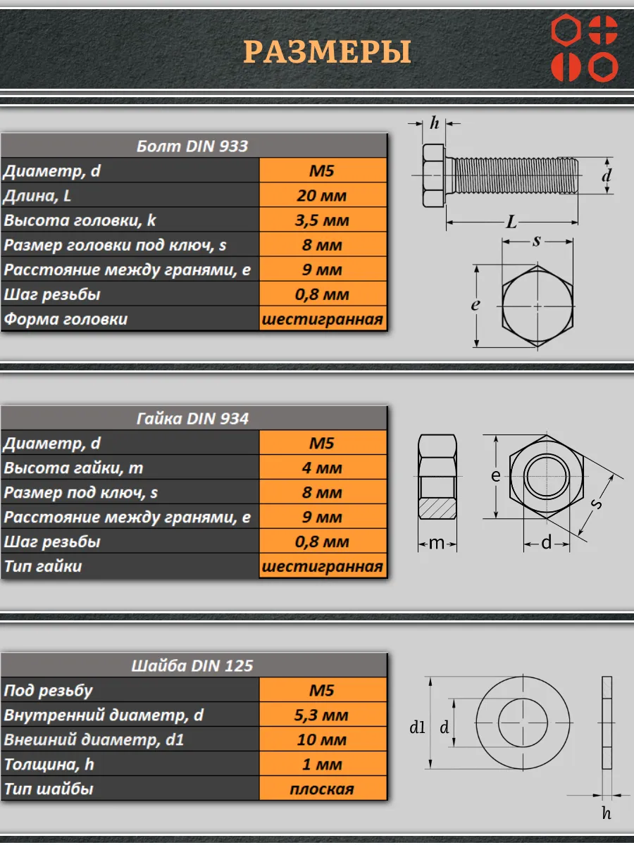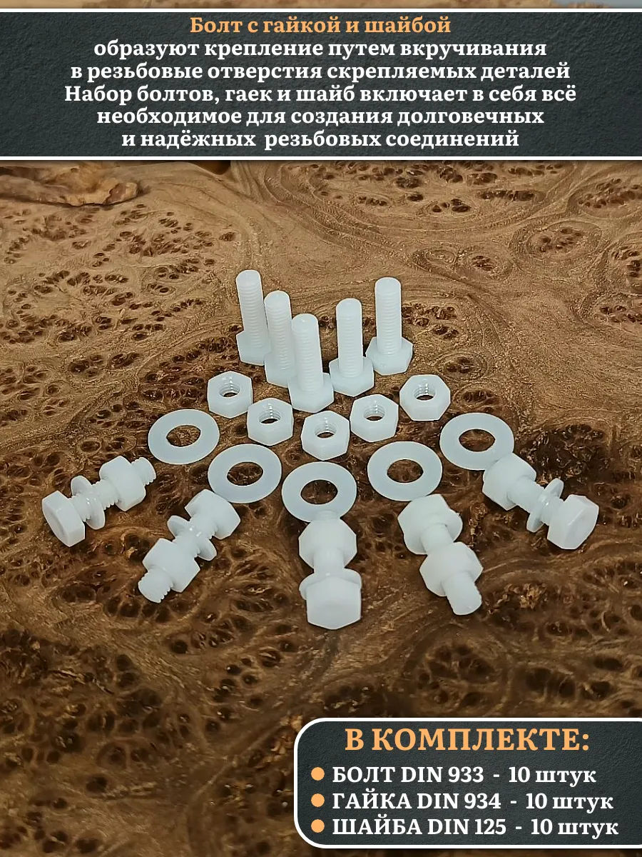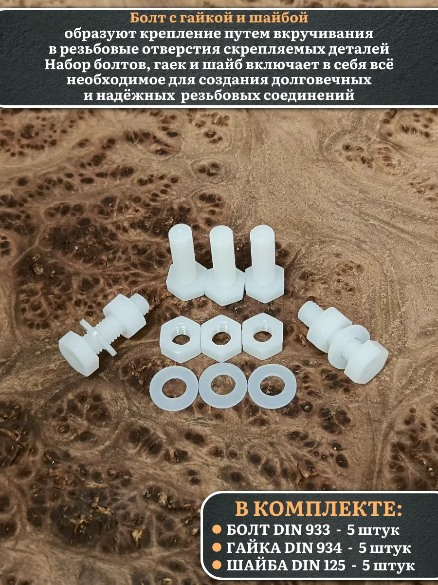 | Болт полиамидный 5х20 мм DIN 933 с гайкой и шайбой, по 10 шт. | бп520933наборГШф10 | 1 шт. |