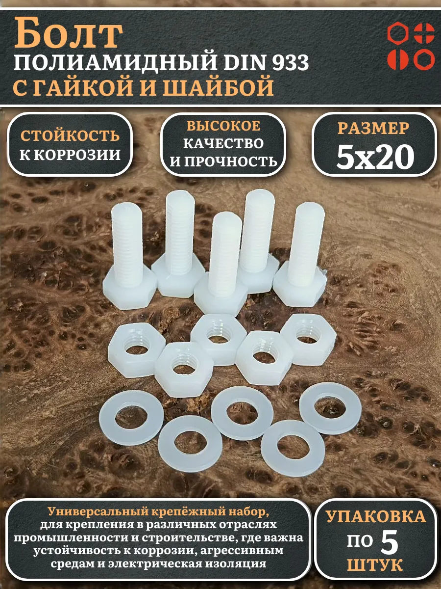 | Болт полиамидный 5х20 мм DIN 933 с гайкой и шайбой, по 5 шт. | бп520933наборГШф5 | 1 шт. |