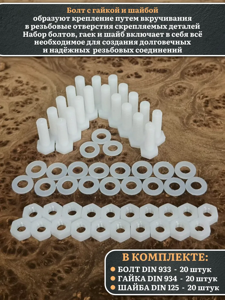 | Болт полиамидный 5х20 мм DIN 933 с гайкой и шайбой, по 20 шт. | бп520933наборГШф20 | 1 шт. |