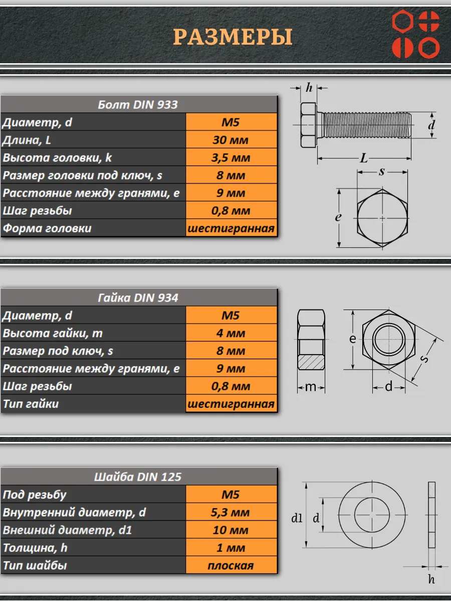| Болт полиамидный 5х30 мм DIN 933 с гайкой и шайбой, по 10 шт. | бп530933наборГШф10 | 1 шт. |