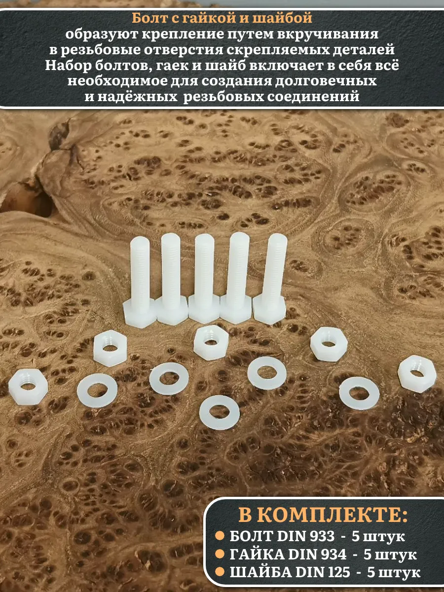 | Болт полиамидный 5х30 мм DIN 933 с гайкой и шайбой, по 5 шт. | бп530933наборГШф5 | 1 шт. |