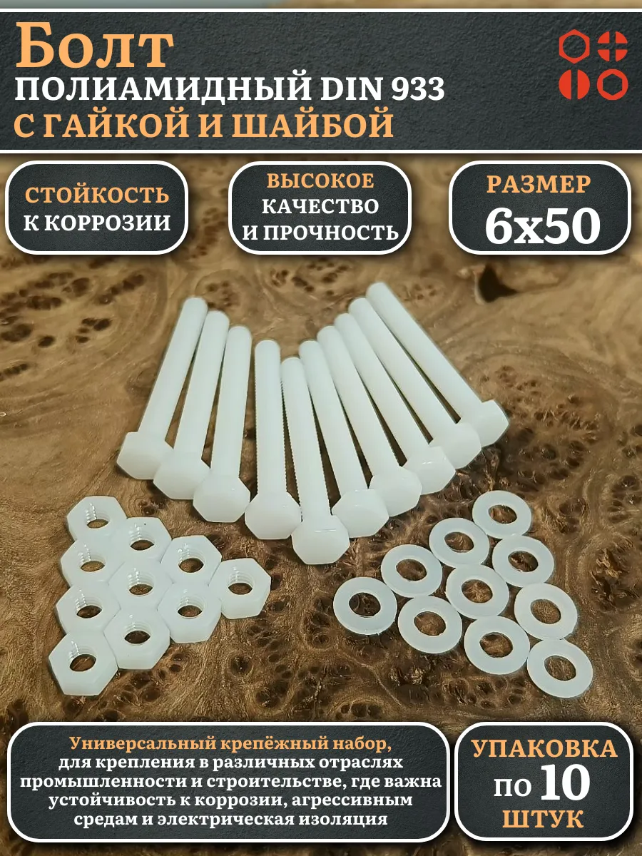 | Болт полиамидный 6х50 мм DIN 933 с гайкой и шайбой, по 10 шт. | бп650933наборГШф10 | 1 шт. |