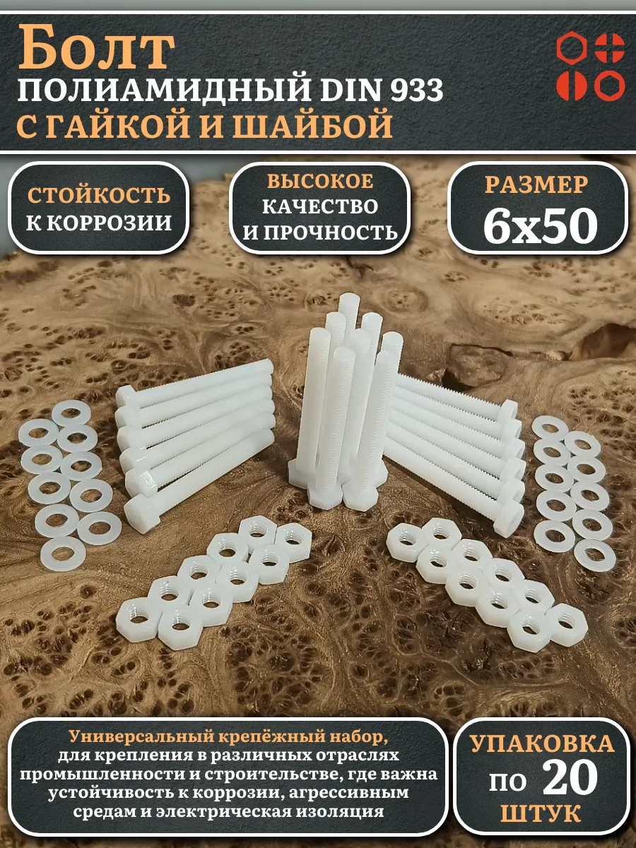| Болт полиамидный 6х50 мм DIN 933 с гайкой и шайбой, по 20 шт. | бп650933наборГШф20 | 1 шт. |