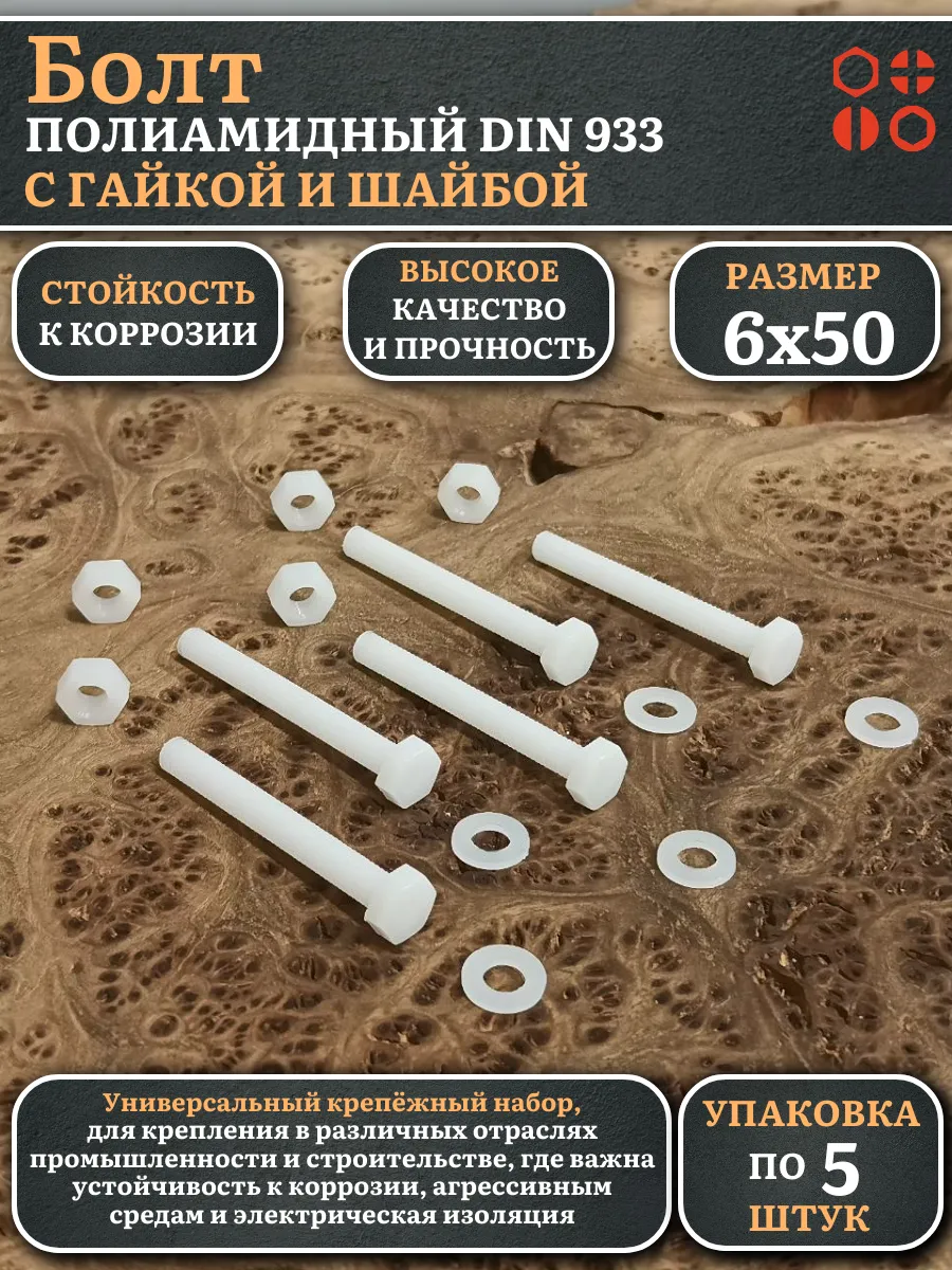 | Болт полиамидный 6х50 мм DIN 933 с гайкой и шайбой, по 5 шт. | бп650933наборГШф5 | 1 шт. |
