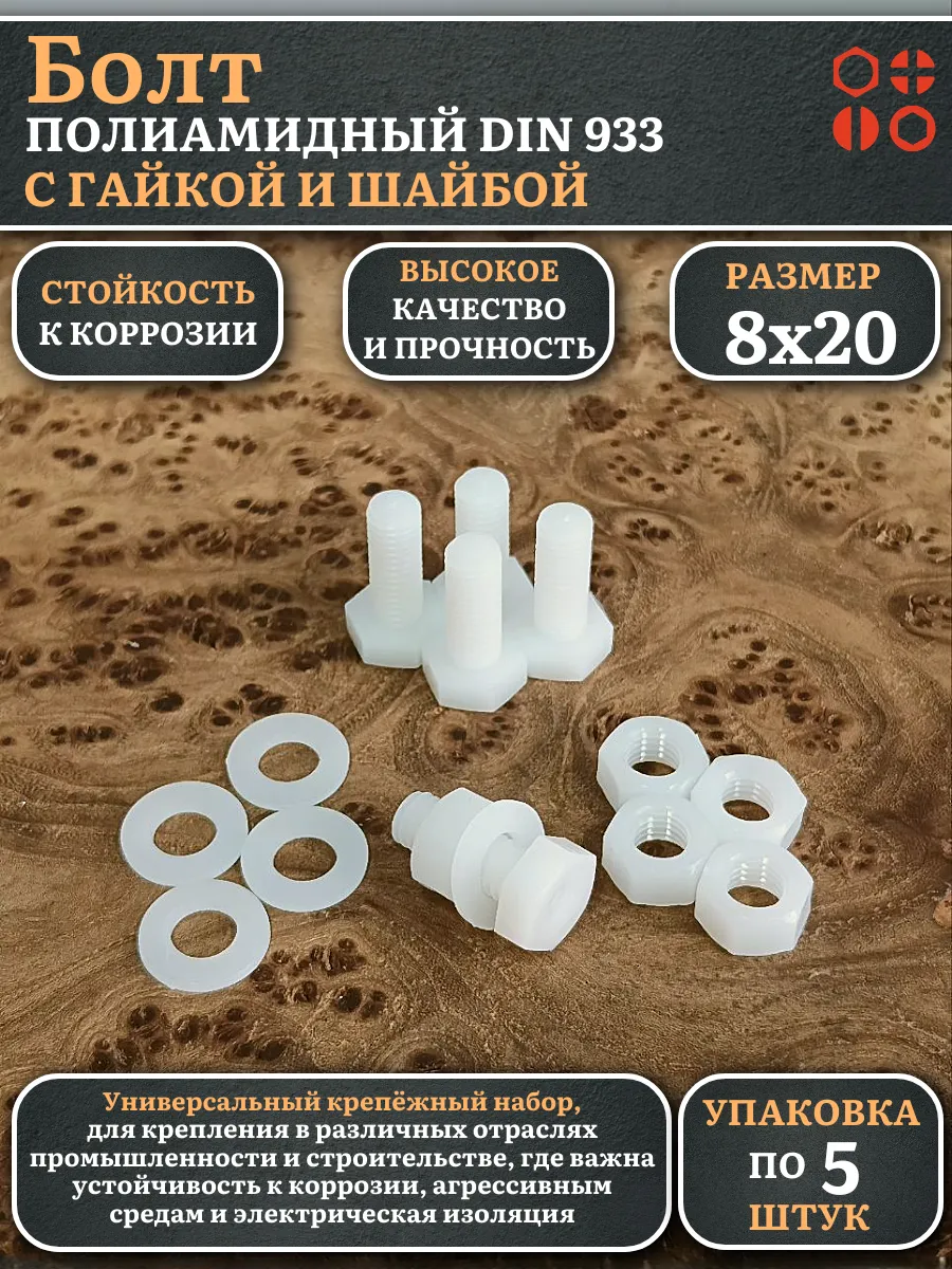 | Болт полиамидный 8х20 мм DIN 933 с гайкой и шайбой, по 5 шт. | бп820933наборГШф5 | 1 шт. |