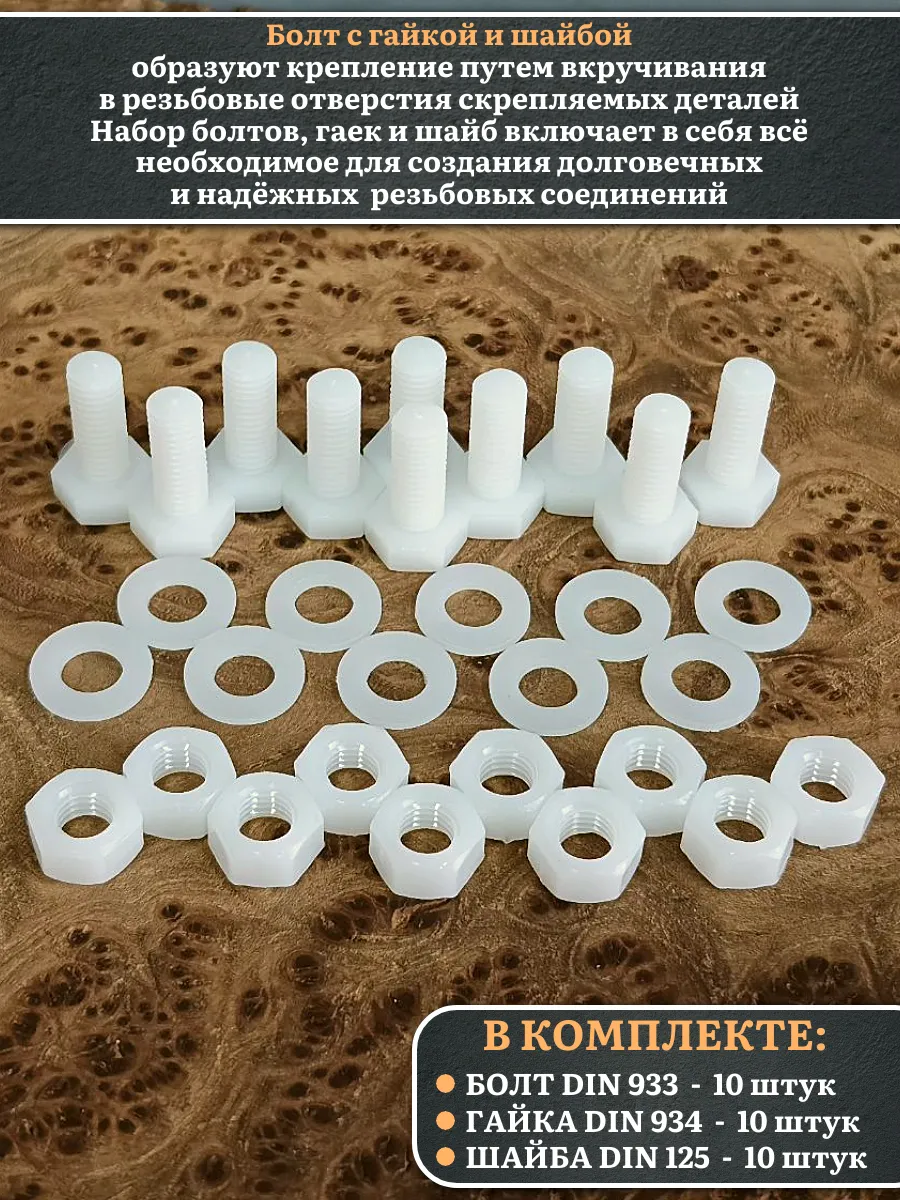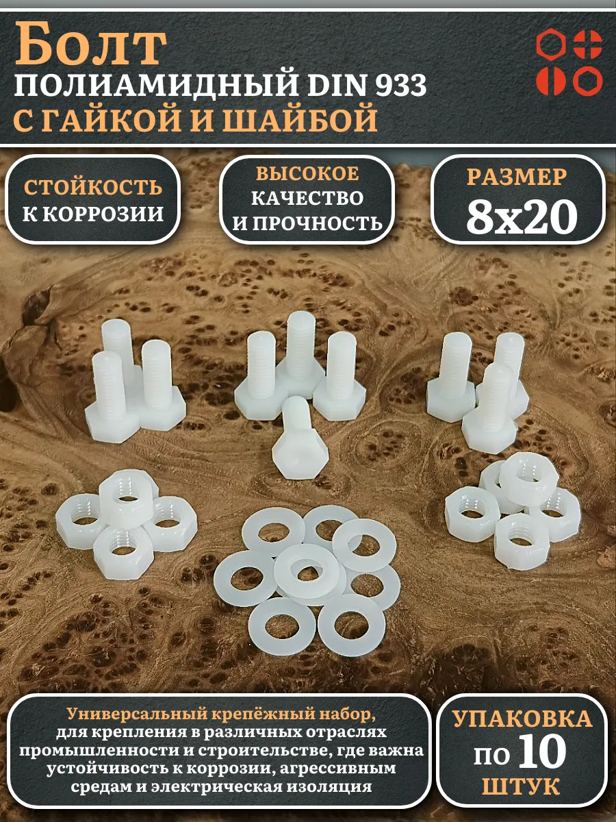 | Болт полиамидный 8х20 мм DIN 933 с гайкой и шайбой, по 10 шт. | бп820933наборГШф10 | 1 шт. |