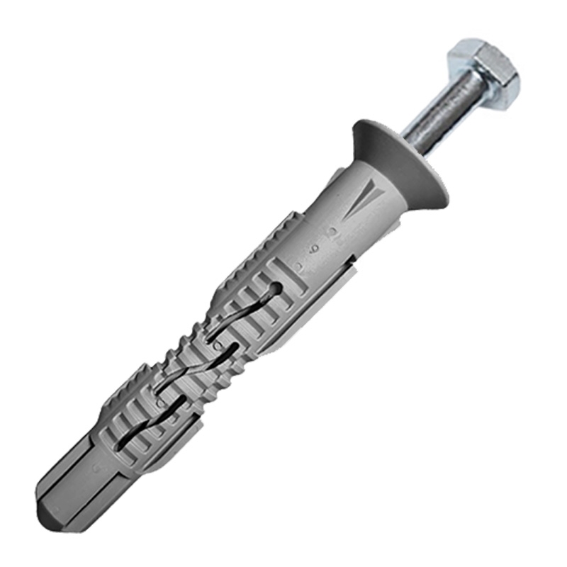 Имеет потайной бортик, позволяющий надежно зафиксировать средненагруженные конструкции, имеющие раззенкованные отверстия или с возможностью утопить головку крепежа в закрепляемом материале. Длина распорной зоны составляет 70 мм, что позволяет надежно закрепиться во всех материалах основания. Наличие стопорных усиков позволяет дюбелю не прокручиваться в пустотелых основаниях. Применяется для сквозного монтажа. Шуруп, входящий в комплект, изготовлен из электрооцинкованной стали, что позволяет использовать дюбель в условиях слабой агрессивной среды.
