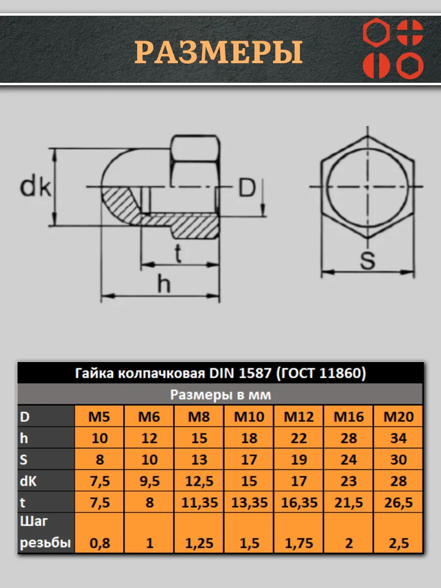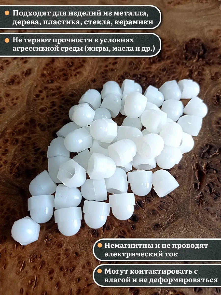 Гайка колпачковая DIN 1587 полиамидная (пластиковая) широко используется в строительстве, машиностроении, приборостроении, сборке габаритной техники и быту. Простая и надежная конструкция делает крепеж универсальным.