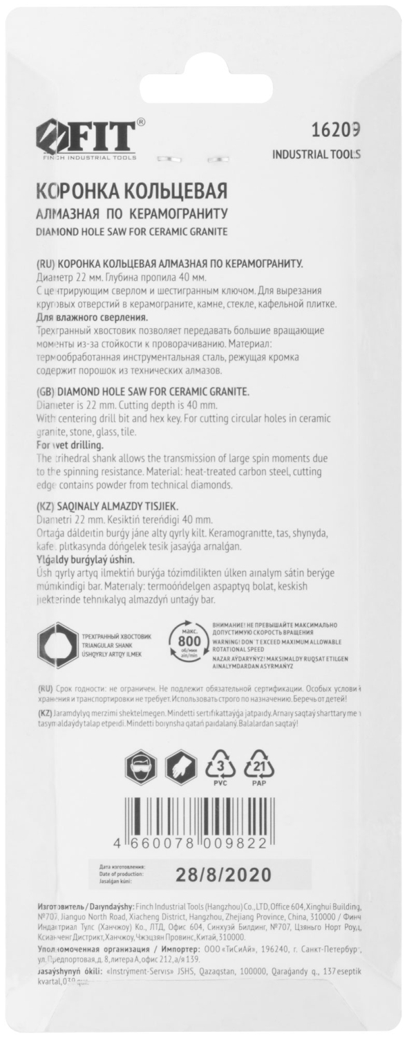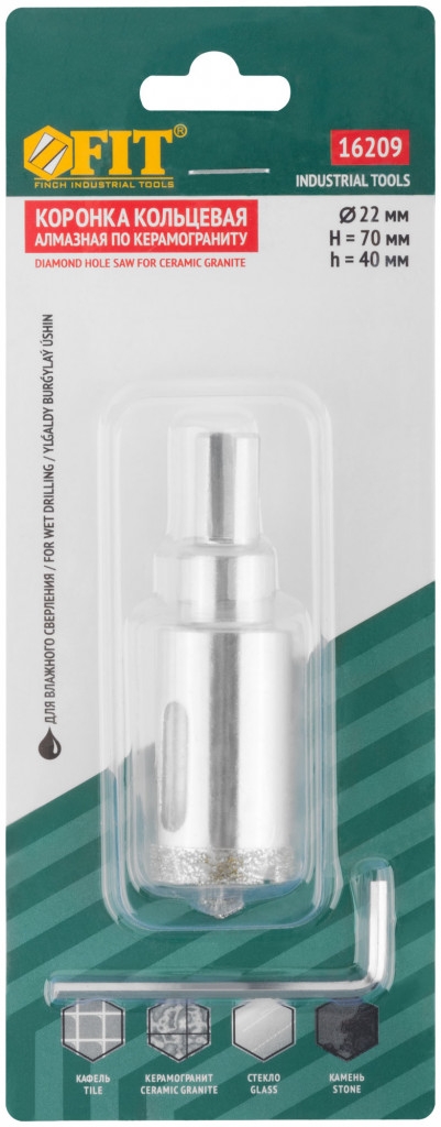 | Коронка по керамограниту, камню и кафелю кольцев с центров сверлом 22х67 мм | 16209 | 1 шт. |
