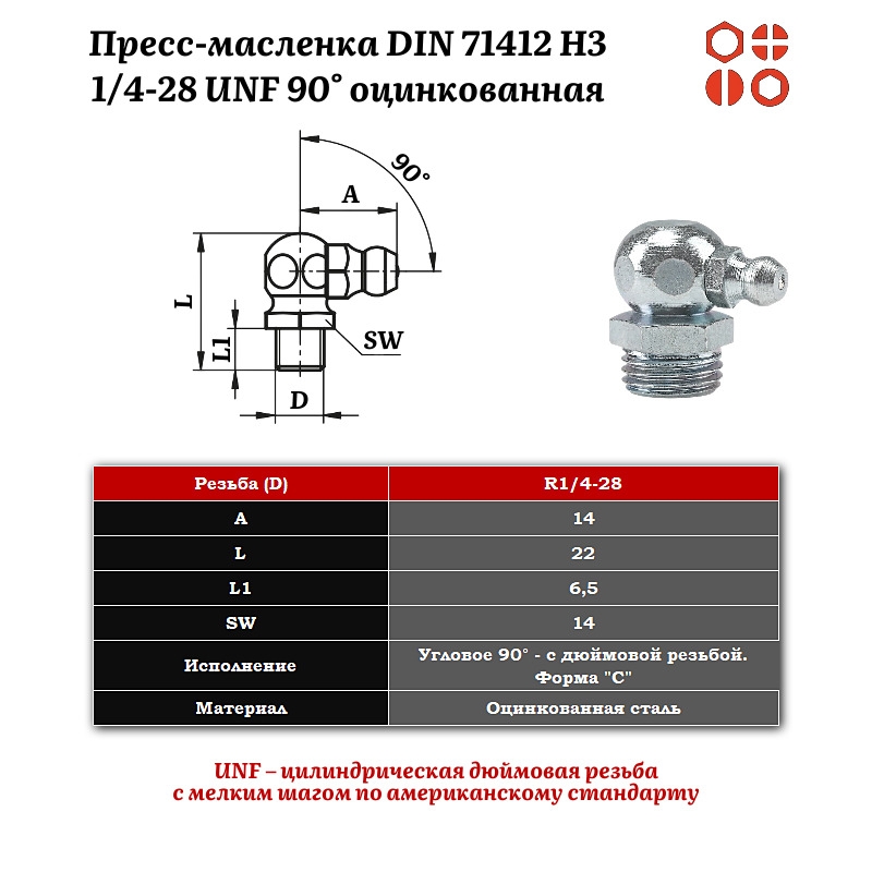 Пресс-масленка 1/4-28 UNF DIN 71412 H3 угловая 90° оцинкованная, 200 шт.