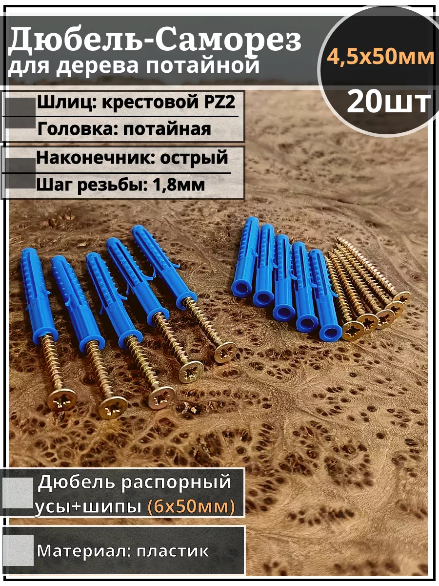 Шуруп саморез 4,5х50 мм ЖЦ с дюбелем 6х50, 20 шт.