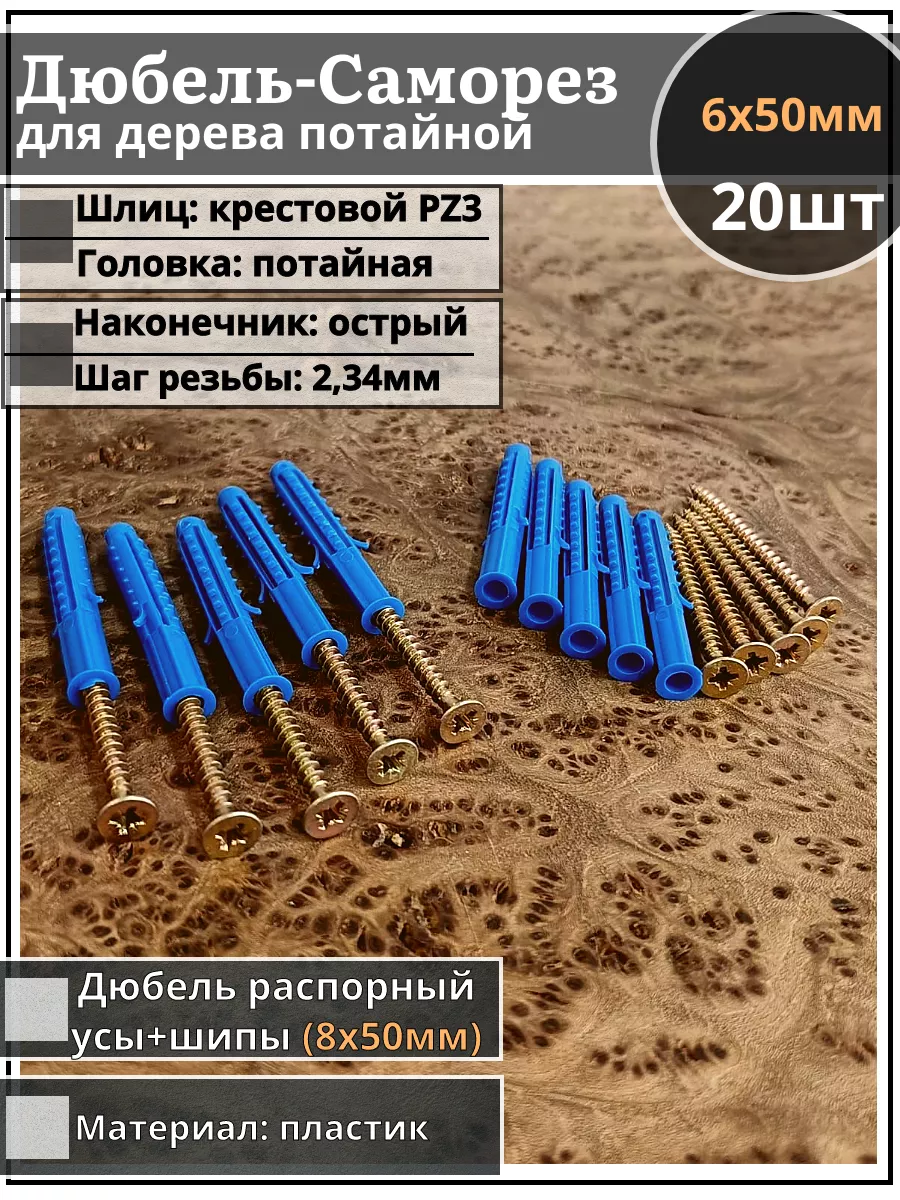 | Шуруп саморез 6х50 мм ЖЦ с дюбелем 8х50, 20 шт. | B04006005062G07/B23300805003000ф20 | 1 шт. |