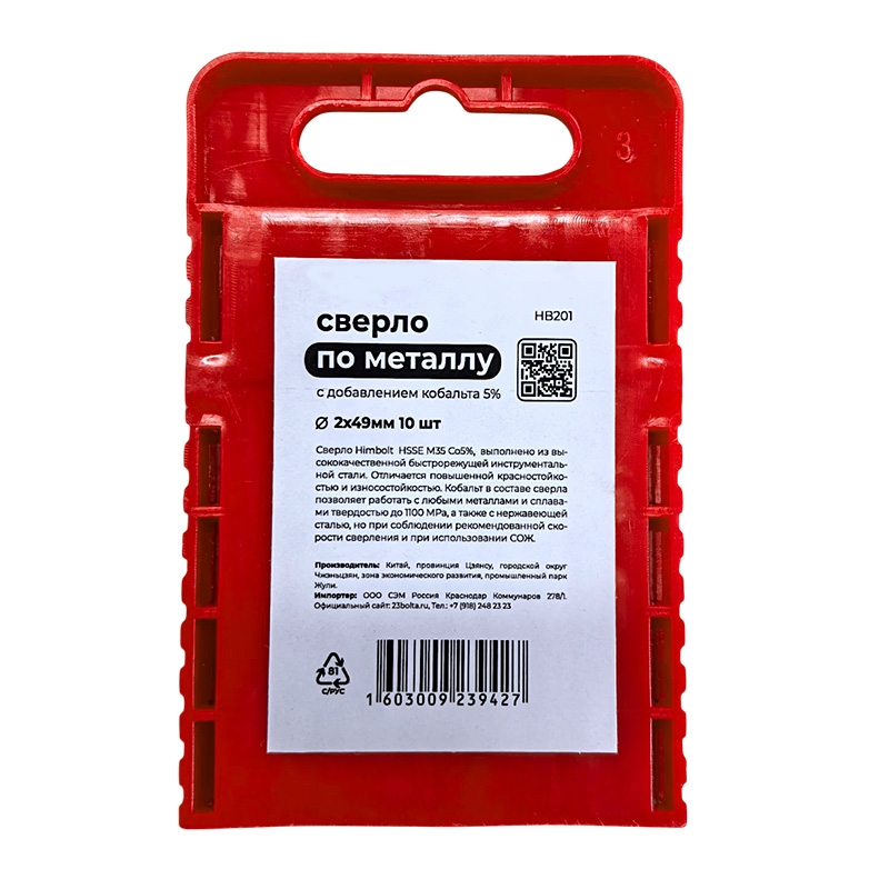 Сверло по металлу с кобальтом 5% P6M5K5 2,0 мм HIMBOLT 10 шт.пластиковый бокс