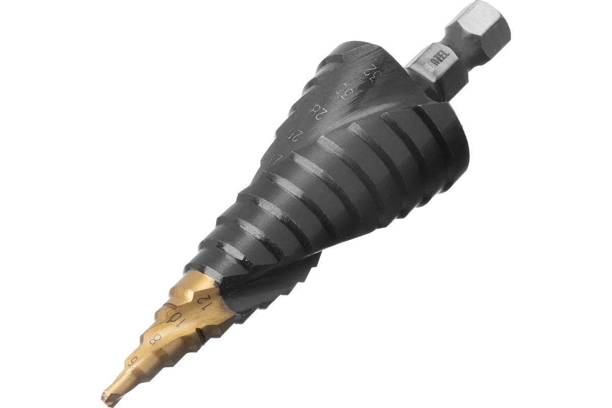 Сверло ступенчатое 4-6-8-10-12-14-16-18-20-22-24-26-28-30-32 мм,Р6М5,шестигр.хв.Denzel