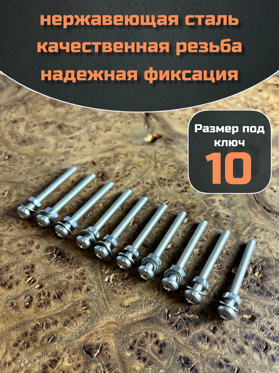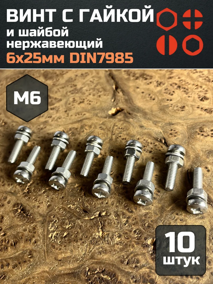 Винт нержавеющий с гайкой и шайбой 6х25 мм DIN7985, 10 шт.