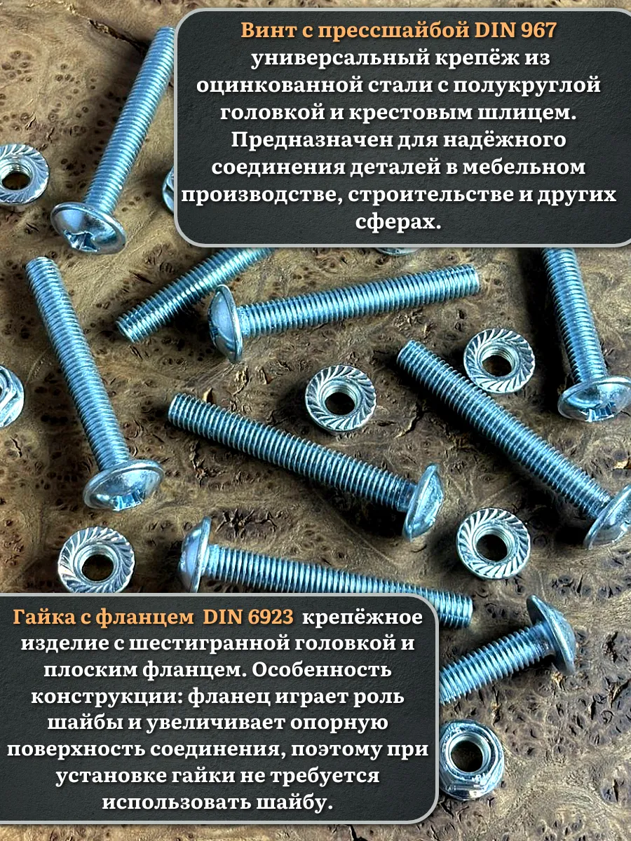 Винт мебельный с полукруглой головкой и прессшайбой, применяется при строительных работах, в машиностроении. Используется для монтажа из металла, пластика и древесины твердых пород. Монтаж производится в заранее подготовленное отверстие с применением гайки соответствующего диаметра, или применятся для вкручивания в различные резьбовые отверстия при монтаже. Винт мебельный DIN 967 — это универсальное крепежное изделие в виде стержня с наружной резьбой, выполненной по всей длинне. Головка крепежа в виде полусферы с широкими полями, на головке имеются пазы под крестовую отвертку. При проведении монтажа можно использовать как PZ, так и SL отвертки или насадки, что делает крепеж универсальным.