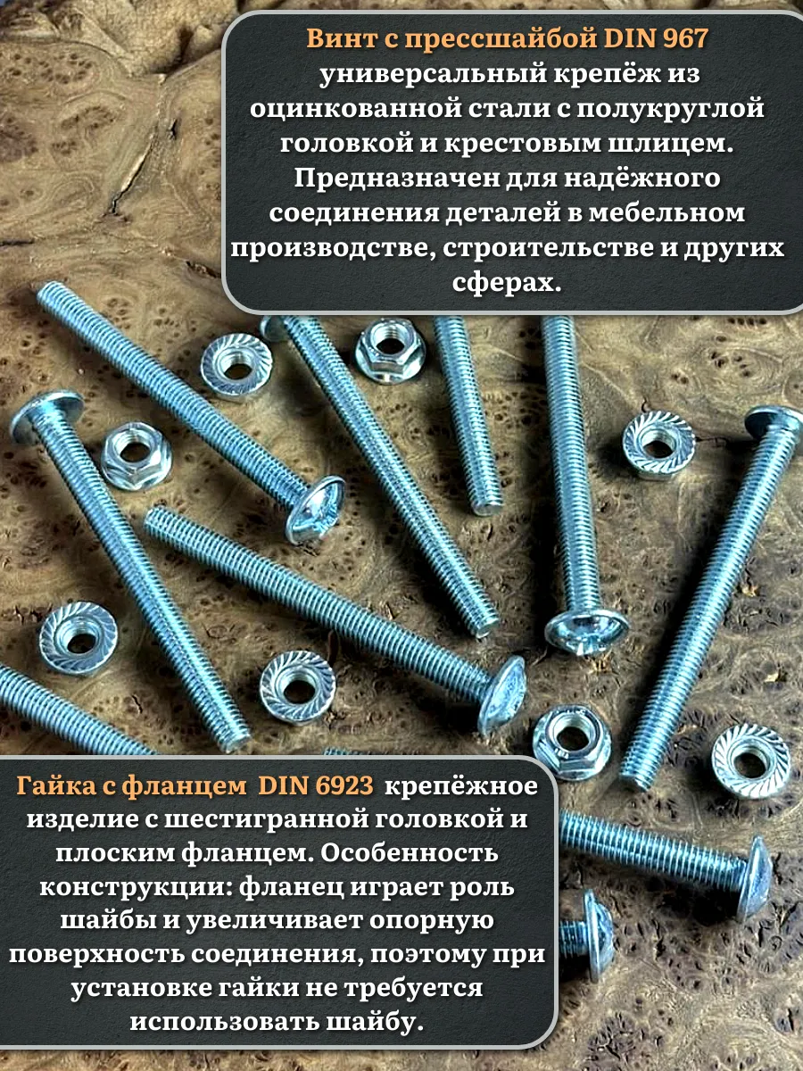 Винт мебельный с полукруглой головкой и прессшайбой, применяется при строительных работах, в машиностроении. Используется для монтажа из металла, пластика и древесины твердых пород. Монтаж производится в заранее подготовленное отверстие с применением гайки соответствующего диаметра, или применятся для вкручивания в различные резьбовые отверстия при монтаже.
