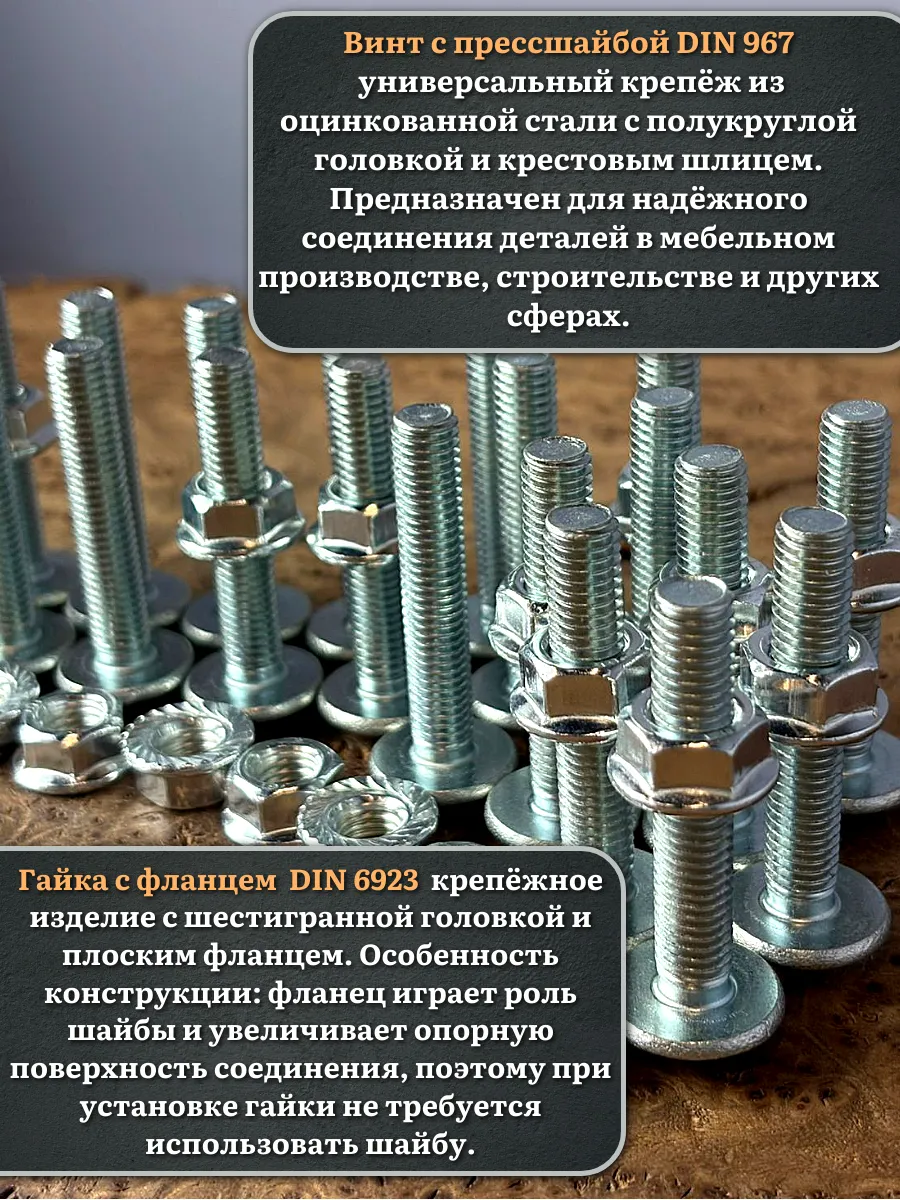 Винт мебельный с полукруглой головкой и прессшайбой, применяется при строительных работах, в машиностроении. Используется для монтажа из металла, пластика и древесины твердых пород. Монтаж производится в заранее подготовленное отверстие с применением гайки соответствующего диаметра, или применятся для вкручивания в различные резьбовые отверстия при монтаже. Винт мебельный DIN 967 — это универсальное крепежное изделие в виде стержня с наружной резьбой, выполненной по всей длинне. Головка крепежа в виде полусферы с широкими полями, на головке имеются пазы под крестовую отвертку. При проведении монтажа можно использовать как PZ, так и SL отвертки или насадки, что делает крепеж универсальным.