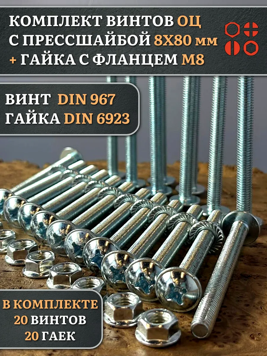 Винт с прессшайбой М8х80 DIN967 с гайкой фланец, 20 шт.