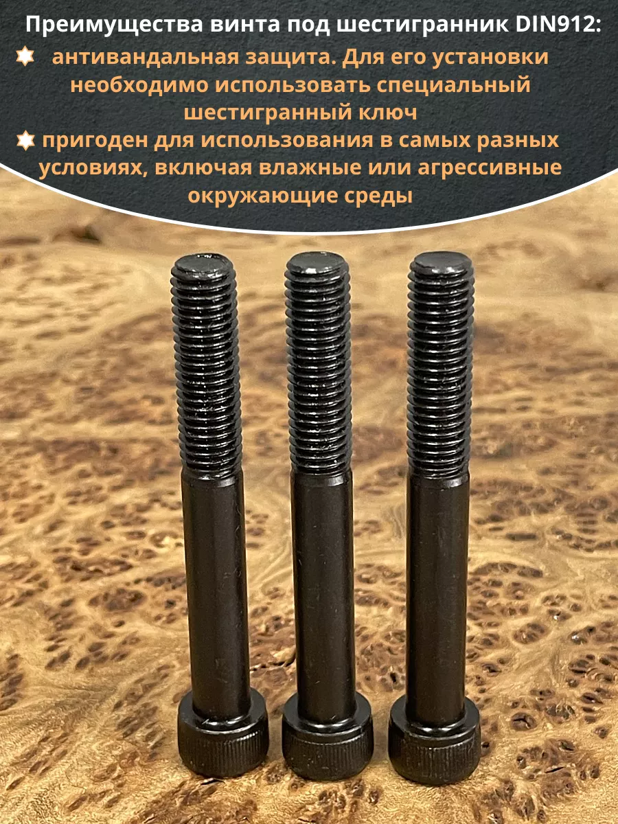 Винт имеет высокую цилиндрическую головку, предназначен для установки его с углублением в отверстие. Закручивается винт при помощи ключа-шестигранника. Высокопрочный винт DIN 912 обеспечивает надежное скрепление узлов и деталей в монтажных и других видах работ. Он имеет головку цилиндрической формы с углублением под соответствующий шестигранный ключ.