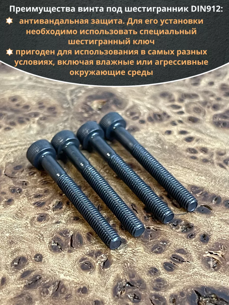 Винт имеет высокую цилиндрическую головку, предназначен для установки его с углублением в отверстие. Закручивается винт при помощи ключа-шестигранника. Высокопрочный винт DIN 912 обеспечивает надежное скрепление узлов и деталей в монтажных и других видах работ. Он имеет головку цилиндрической формы с углублением под соответствующий шестигранный ключ.
