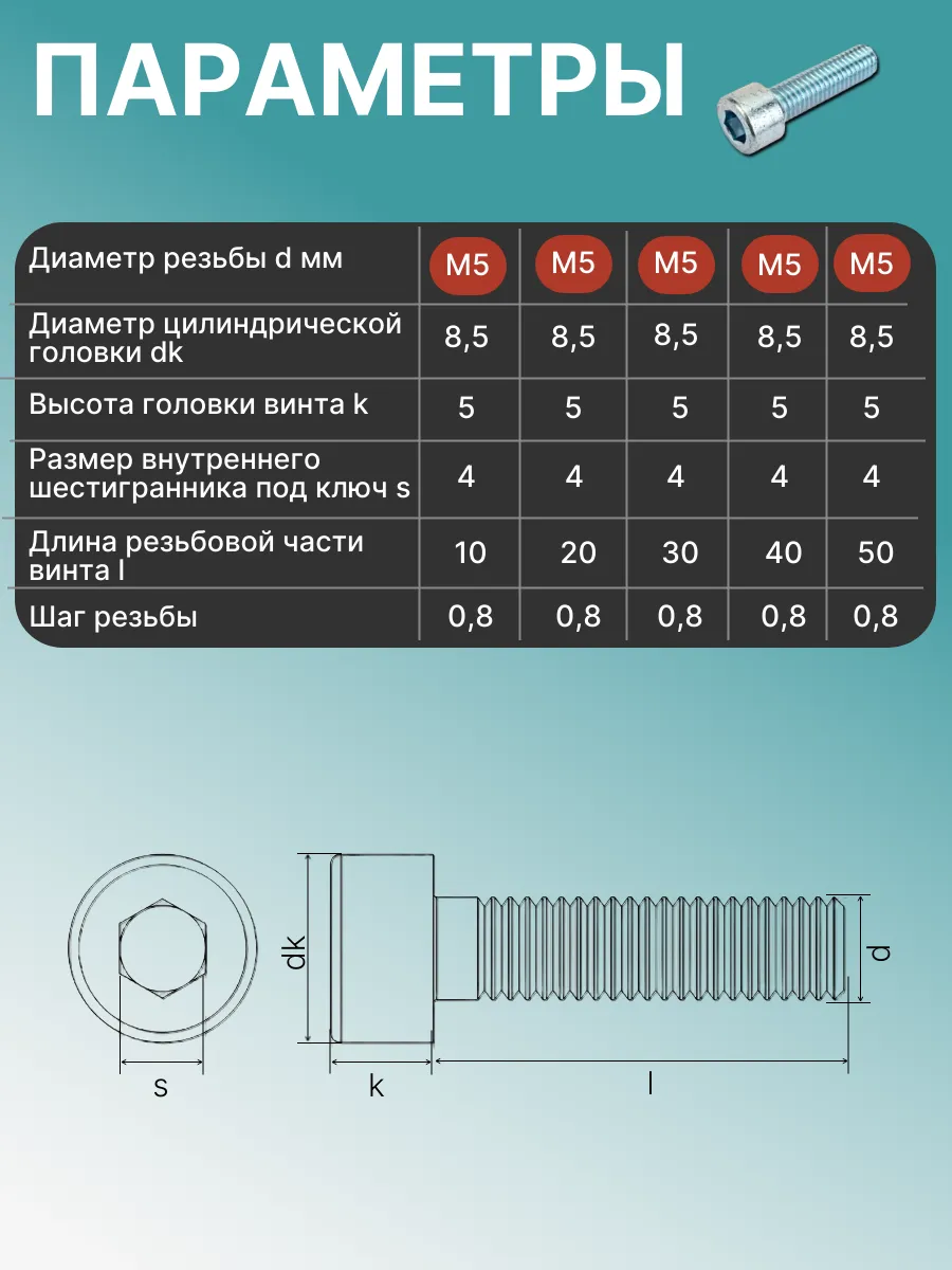 Винт с внут.шестигр. 5х50 мм класс прочности 8.8 DIN 912 полная резьба, оцинкованный - 30 шт