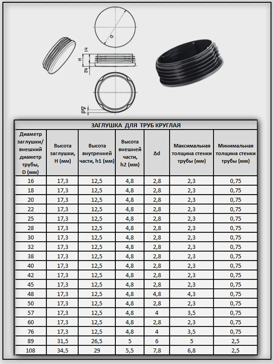 | Заглушка для труб круглая d 20 мм черная, 50 шт. | 26-0025ф50 | 1 шт. |