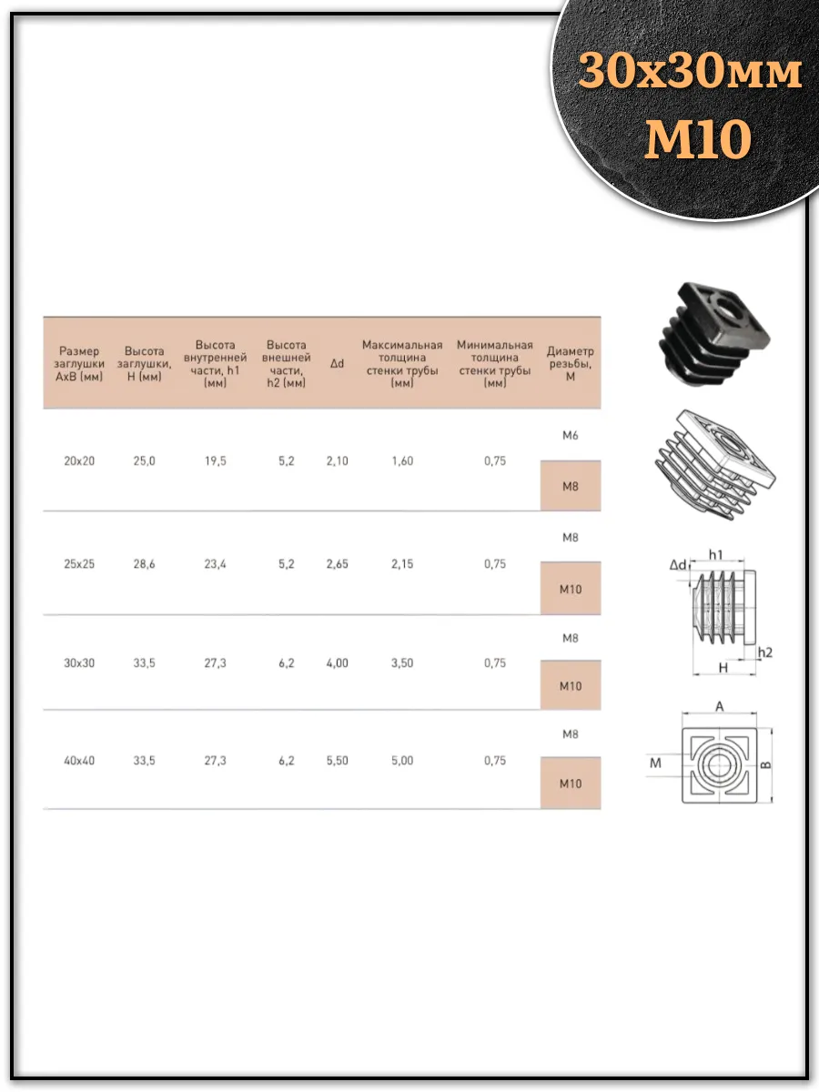 | Заглушка для труб квадратная 30х30 мм с резьбой М10, 10 шт. | 32-0125ф10 | 1 шт. |
