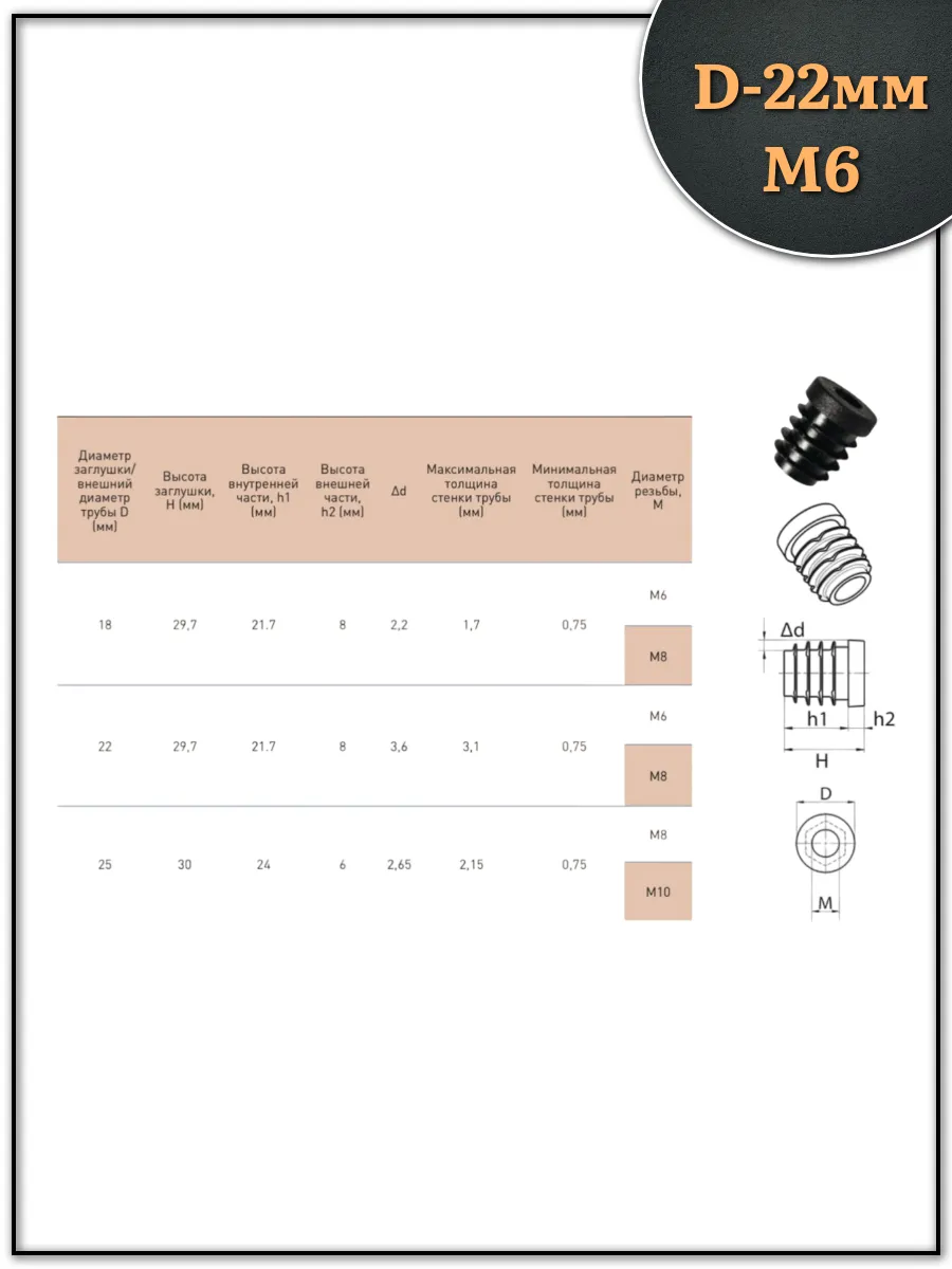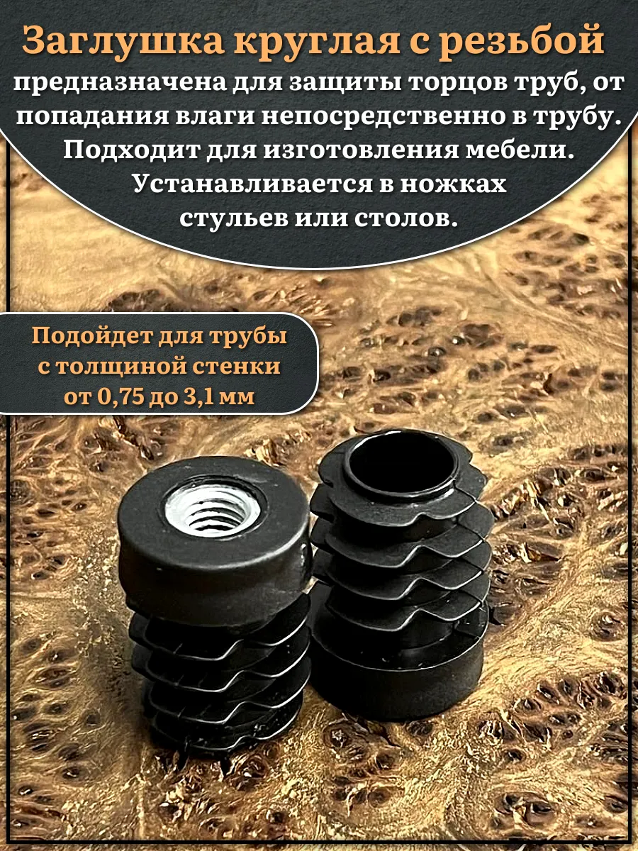 | Заглушка для труб с резьбой М6 круглая d 22 мм, 10 шт. | 32-0230ф10 | 1 шт. |